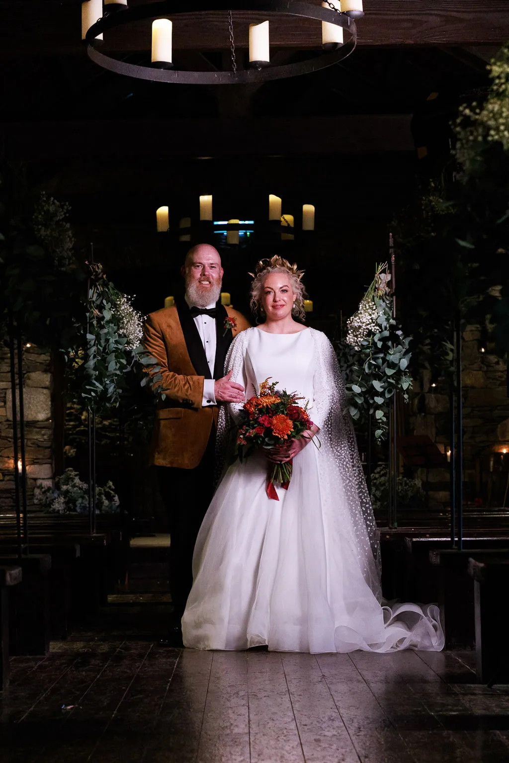 Sharing a lovely first look before her ceremony, our radiant bride wore a chic Mikaella gown paired with our Jesus Peiro embellished tulle cape.
