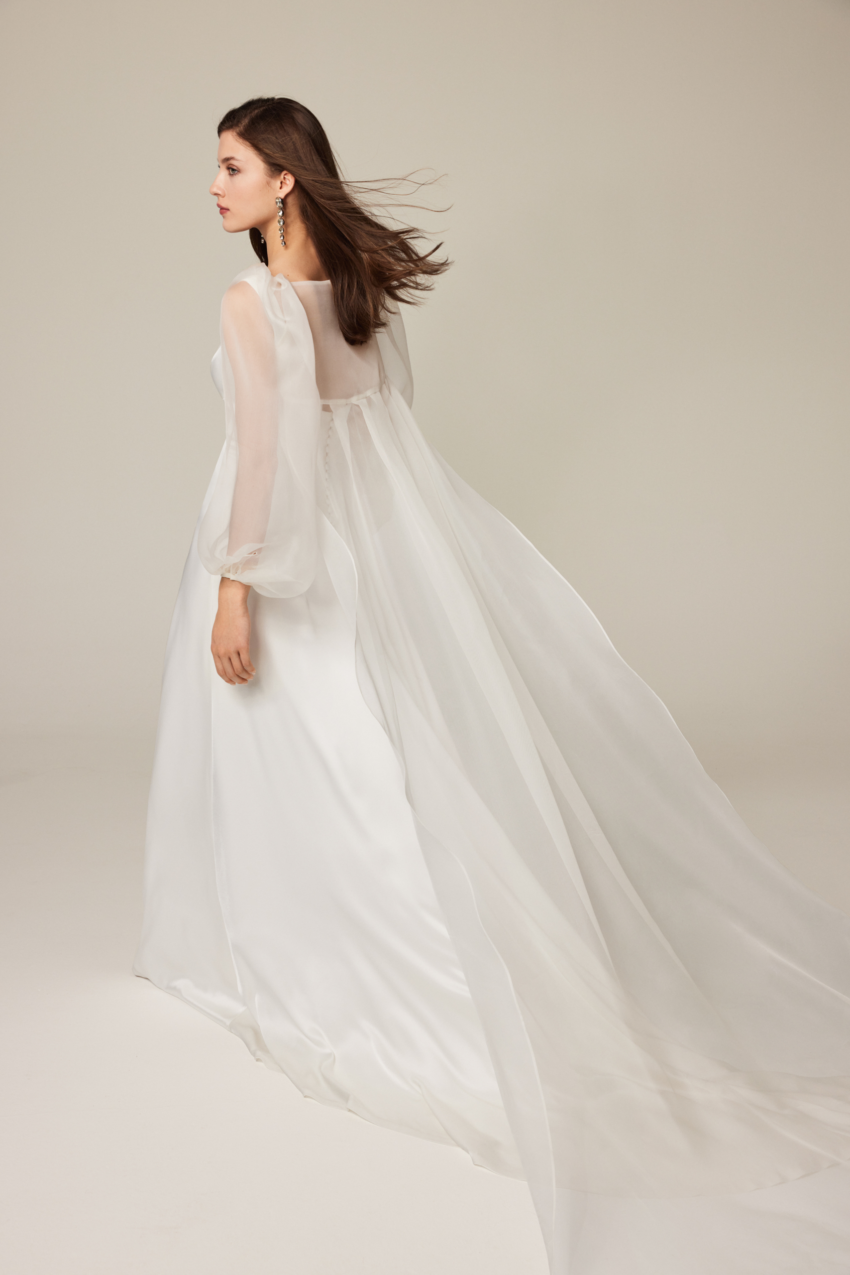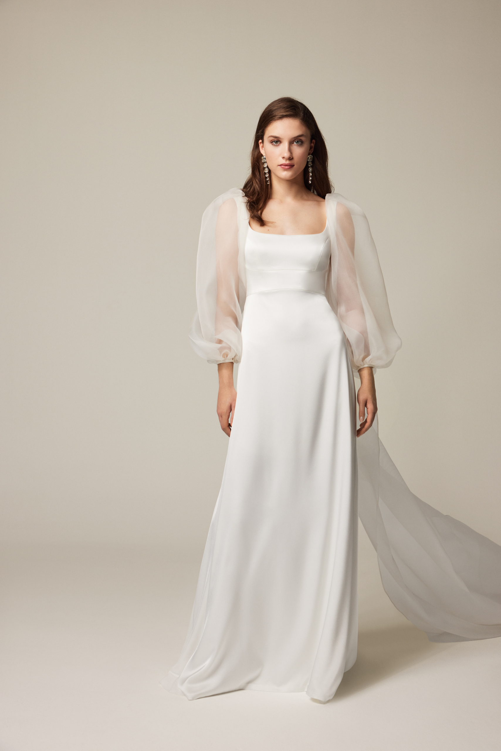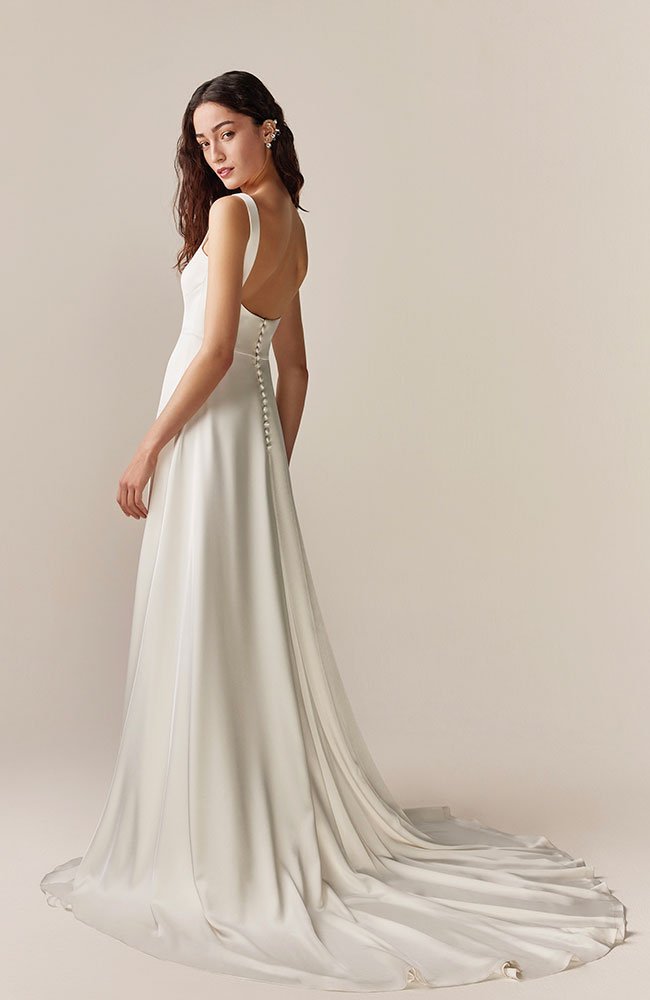 Lucca satin wedding dress with silk gauze cape. Dress and cape can be ordered separately.