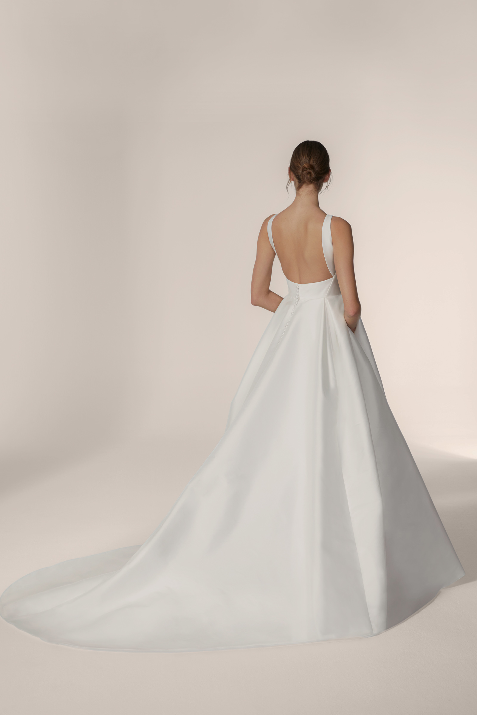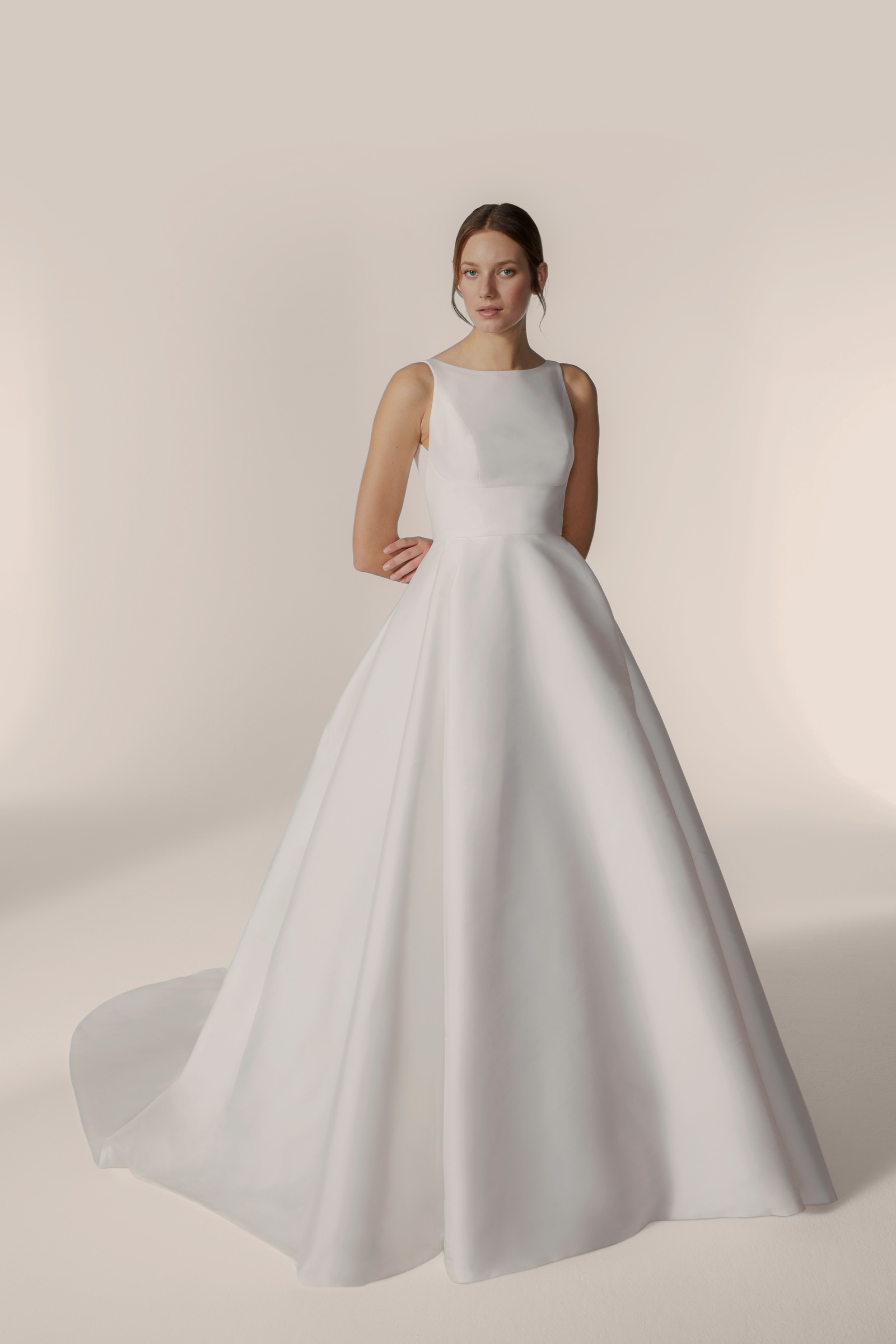 Full-skirted gown in mikado taffeta with a boat neckline and a low back.