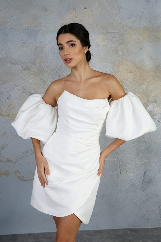 Soft, structured satin mini wedding dress – perfect for th bride who loves dancing.