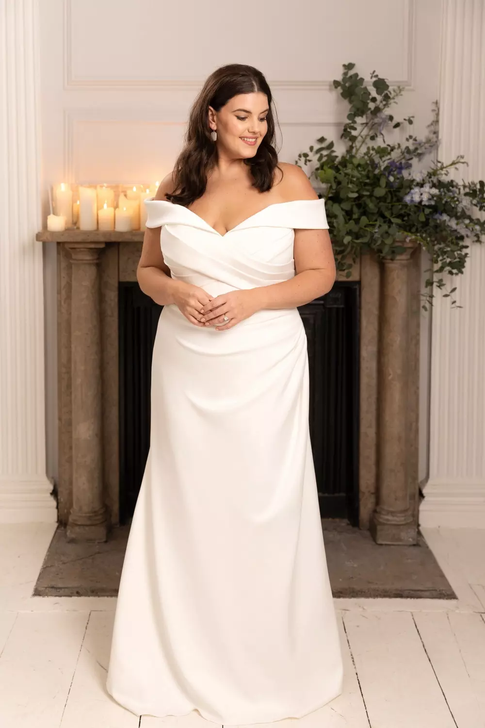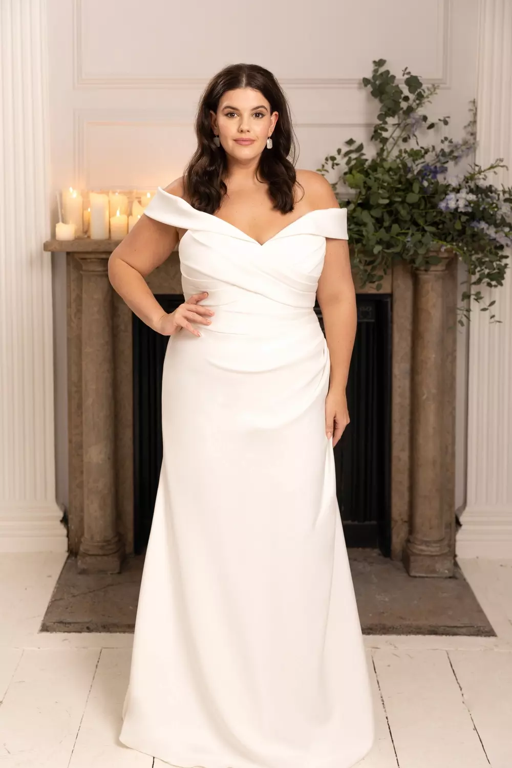 Monroe from True Curves Collection by True Bride is a beautifully created fit and flare wedding dress for brides with curves. Designed with comfortable stretch crepé. This amazing gown fits amazingly on the body to give the most figure flattering style. Off the shoulder straps with sweetheart neckline. Pleating and ruching on the bodice and waist to give great confidence. Fit and flare skirt with buttons running to the end of the train.