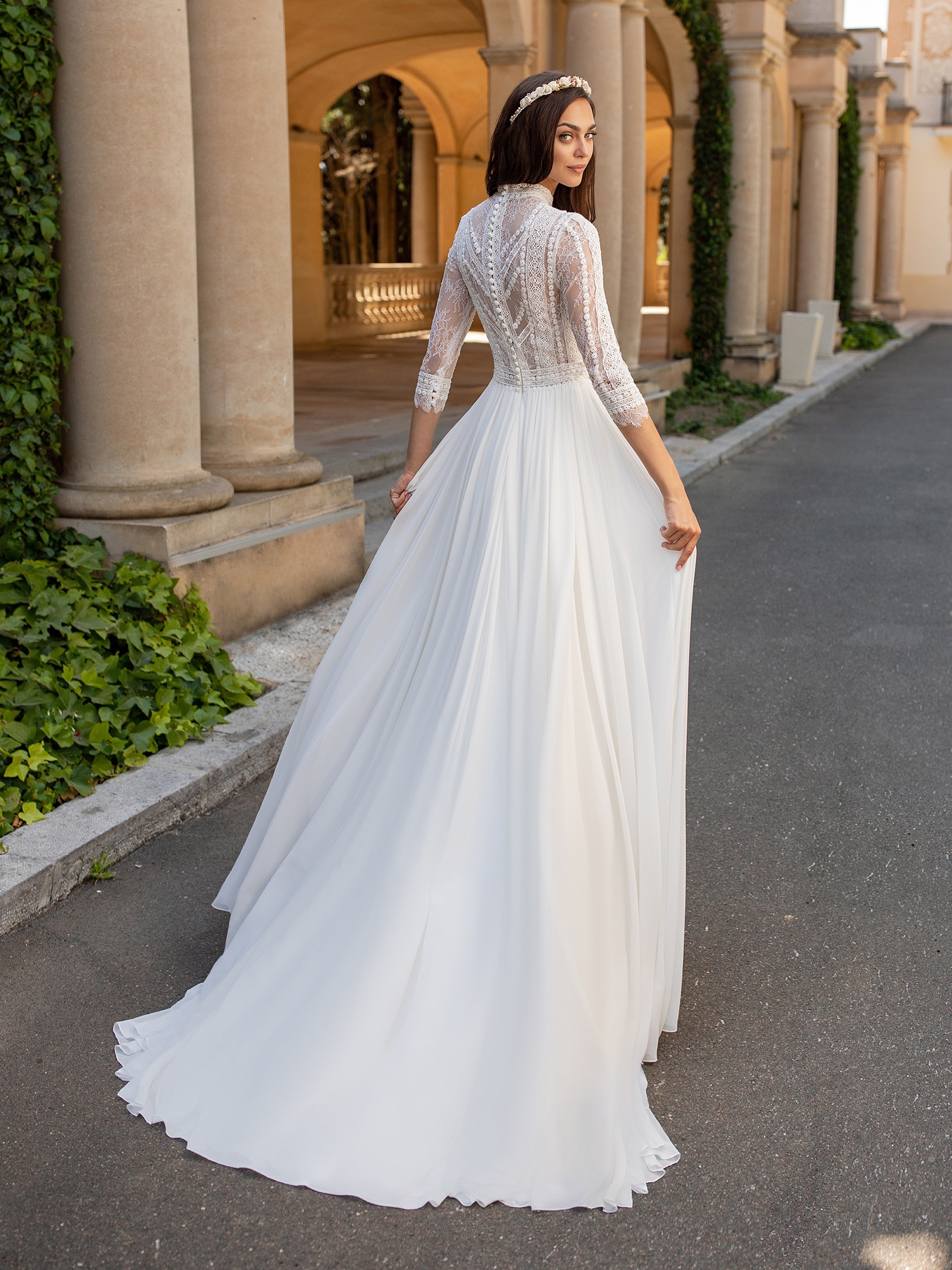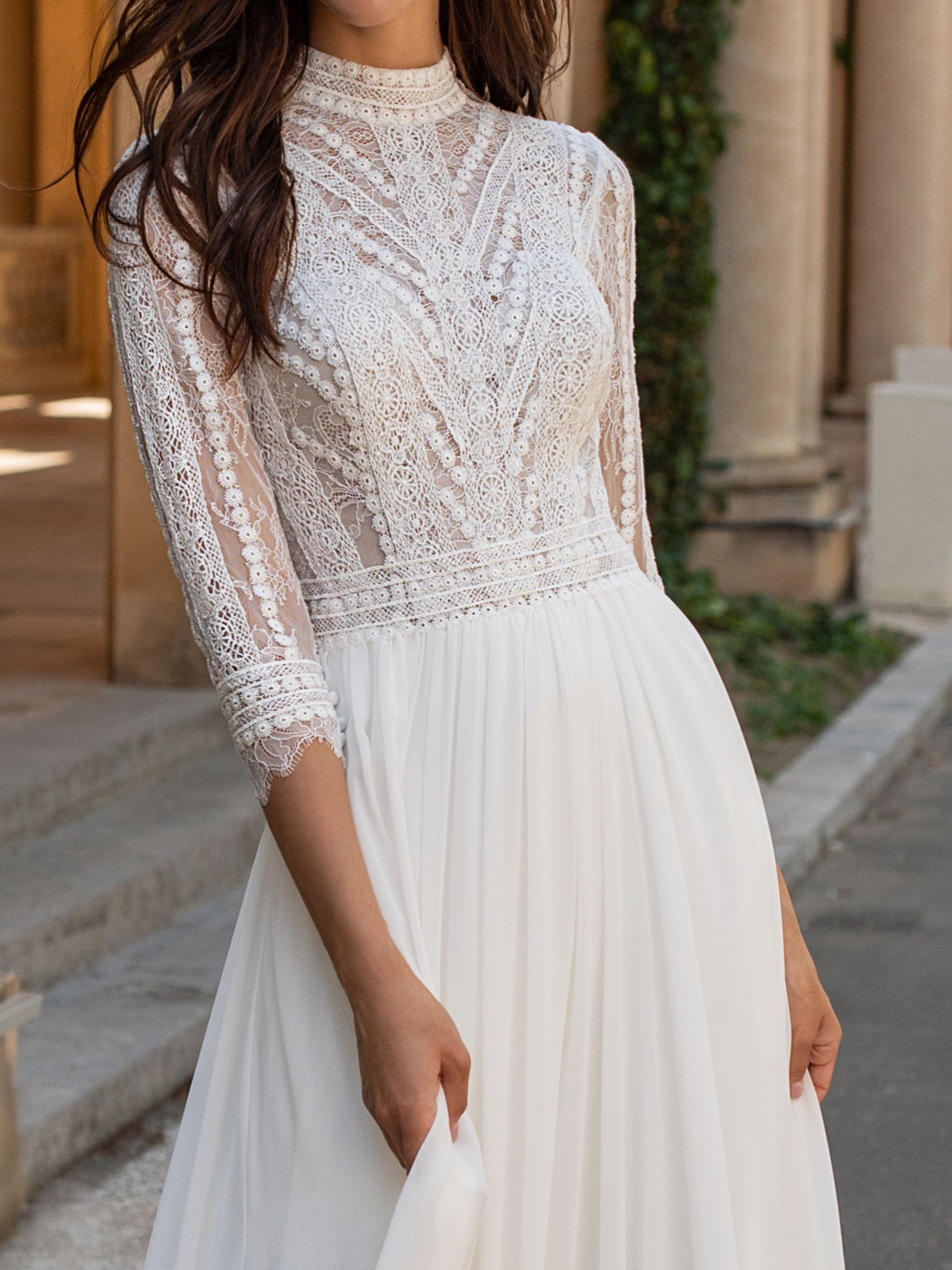 Bohemian with a chic touch and the delicateness of the most exquisite romanticism. That describes this sensual dress with chiffon evasé skirt with natural waist, combined with an original Chantilly and semi-sheer guipure bodice with high neckline and 3/4 sleeves.