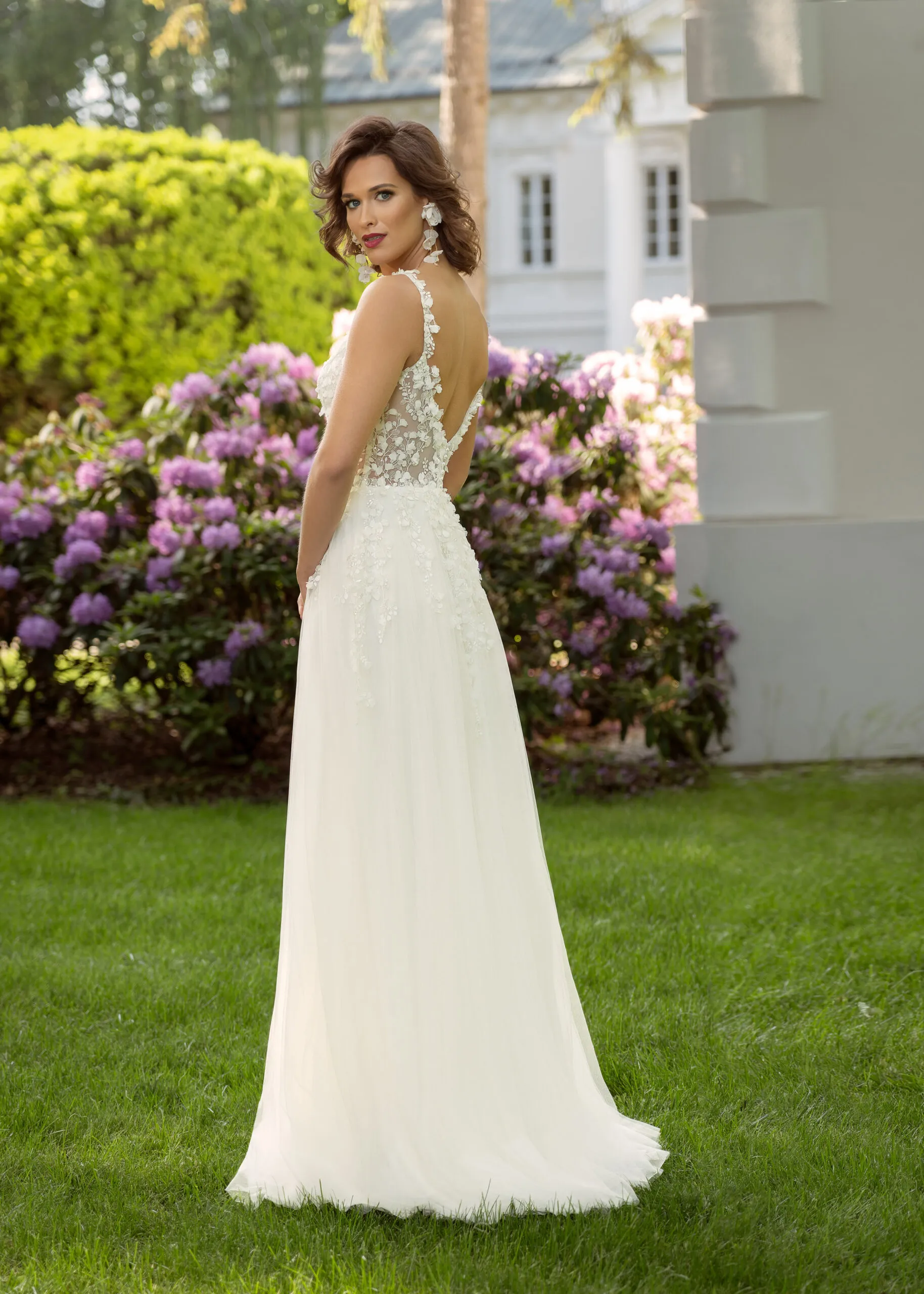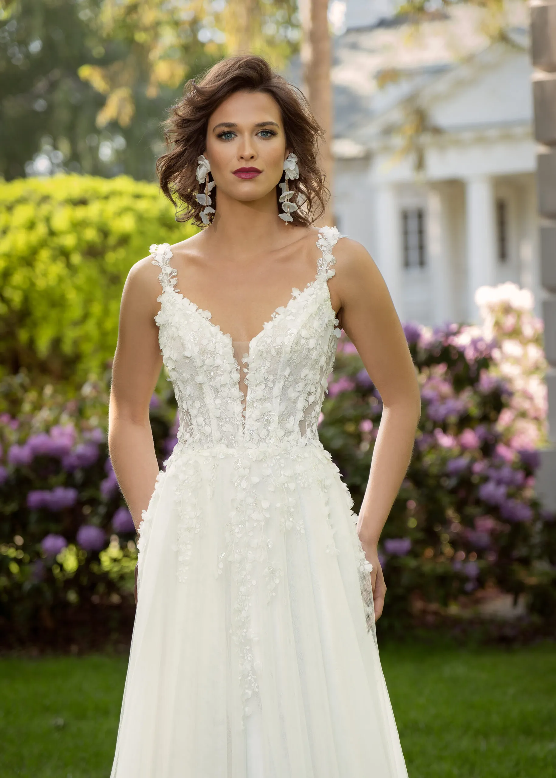Tonia from Margarett Bridal is a delightful soft tulle wedding dress for a modern bride, available in The White Room, Mullingar. Delicate lace straps with plunging V-neckline. 3D flowers are scattered throughout the bodice and top of the skirt, complimenting the softly sparkled lace. V-back, finished with luxurious pearl buttons. Soft tulle aline skirt with lace and 3D flowers cascading onto the top of the skirt and a peek-a-boo slit.