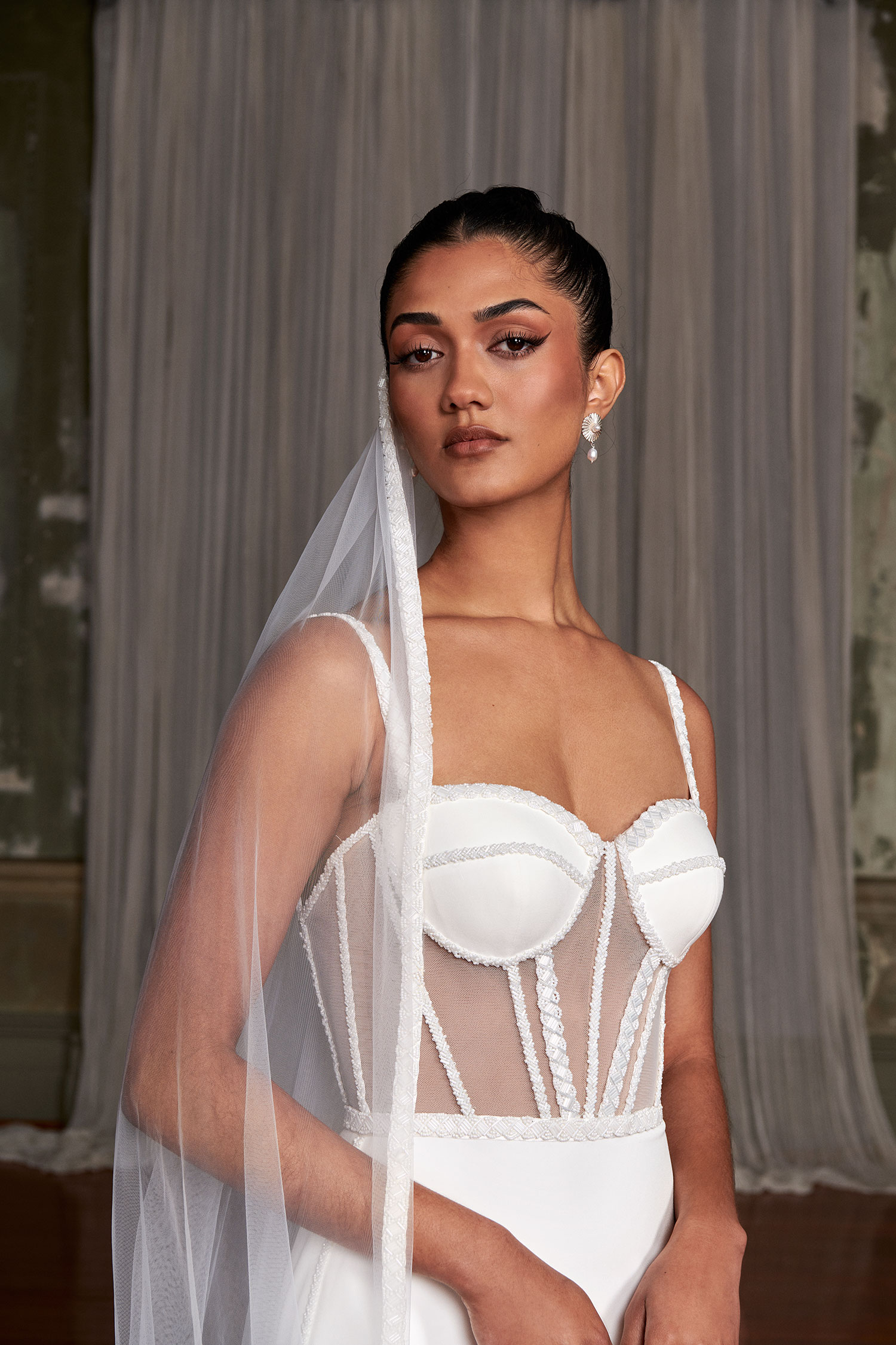 The Zana veil is the epitome of glamour and sophistication. With a chapel length and a stunning beaded trim, it is the perfect complement to any bridal look. While it is designed to pair with the Zana wedding dress, its versatile style makes it a great choice to match with any wedding dress.